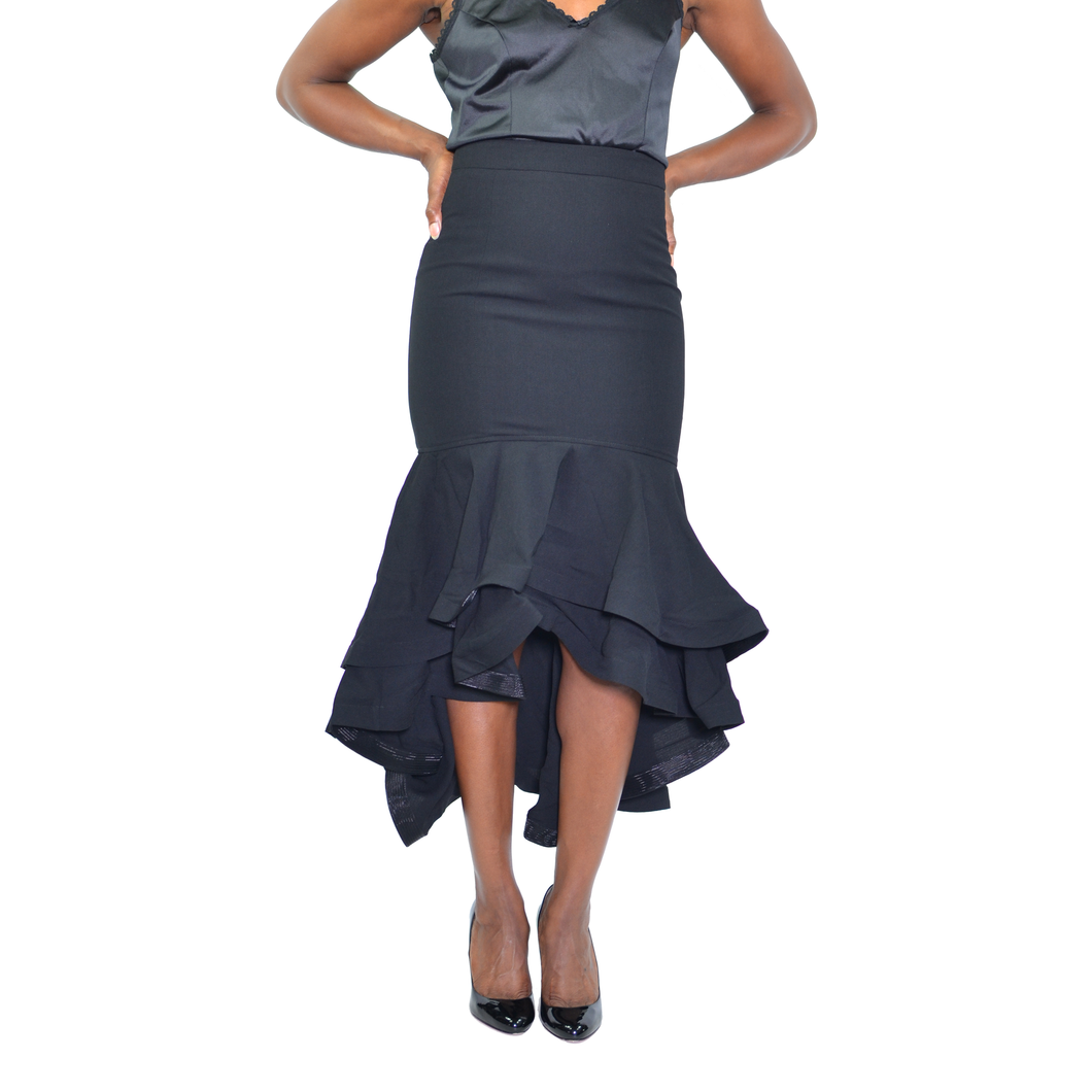 Bring the spice with this sexy hi-low skirt! Pair with a backless halter and your highest stiletto. (Belt not included)